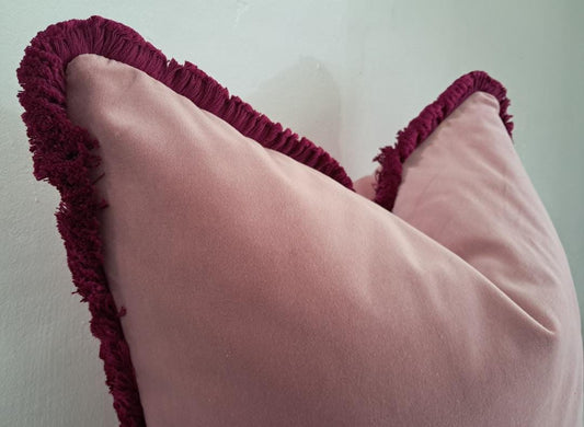 Velvet Throw Pillow Cover, Pink Cotton Velvet Cushion, Dusty Pink with Fuschia Fringe