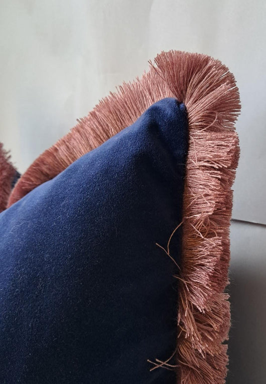 Velvet Pillow Cover, Navy Cotton Velvet Cushion, Midnight Blue with Dusty Pink Fringe